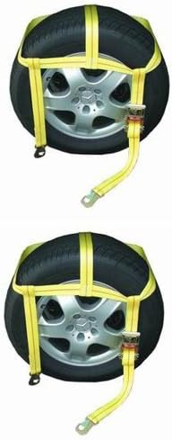 Some models include rubber blocks that securely fit into the treads of the tire to ensure the strap stays positioned within the threads. Fomobest Car Tie Down Straps Heavy Duty 10000 lbs for Trailers 4 Pack Wheel Tow Ratchet with Snap Hooks 2x 12ft Tire Straps with Axle Straps for Car Hauler Vehicle Trucks - Fits for All Sizes Tires. 44 out of 5 stars 46.
