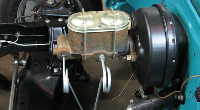 A power brake booster is installed and connected directly to the brake pedal. Back in the day when most cars had drum brakes power brakes were not really necessary -- drum brakes naturally provide some of their own power assist. This makes the brake pedal much easier to press down and improves the braking response of the vehicle.