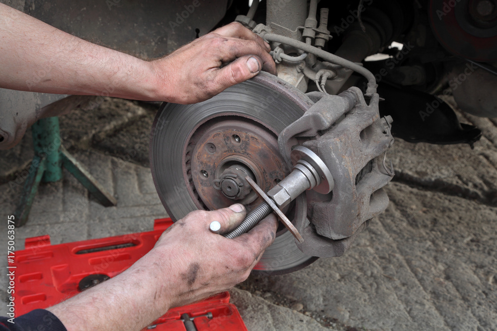 Mechanic Fix Car Disc Brakes With Disc Brake Caliper Tool Set Wall Mural Sima