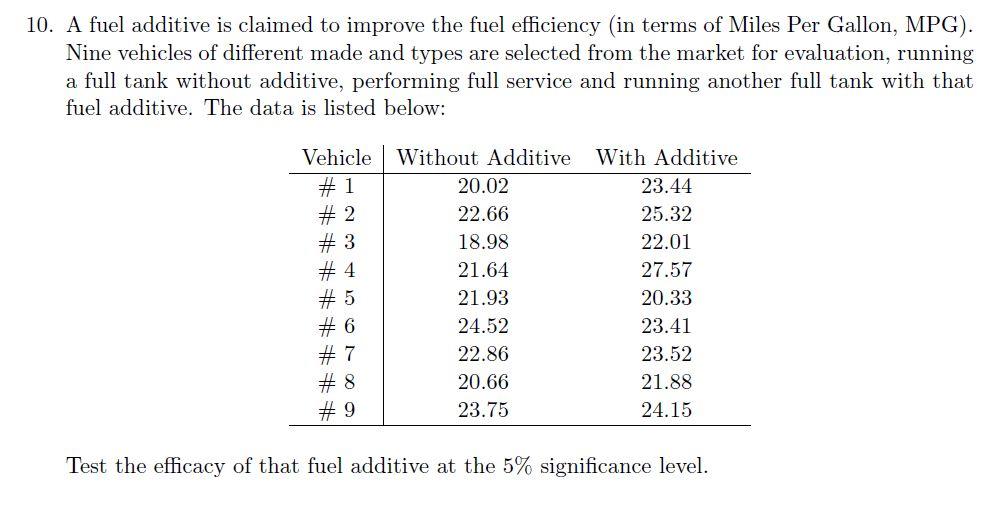 Solved 10 A Fuel Additive Is Claimed To Improve The Fuel Chegg Com